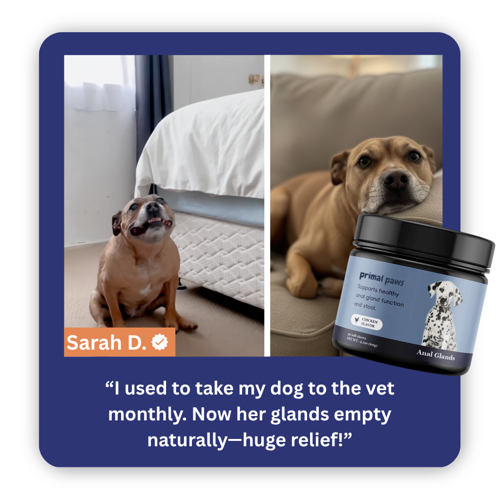 Our gut-and-gland blend works deeper, supporting healthy digestion, firmer stools, and natural gland emptying so your dog finally finds real relief.