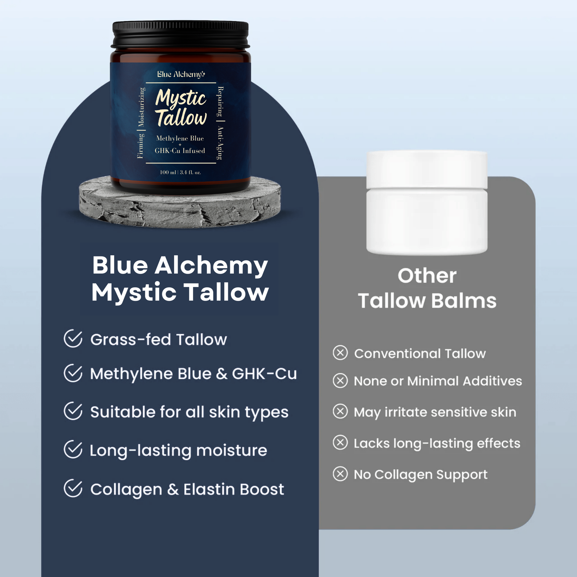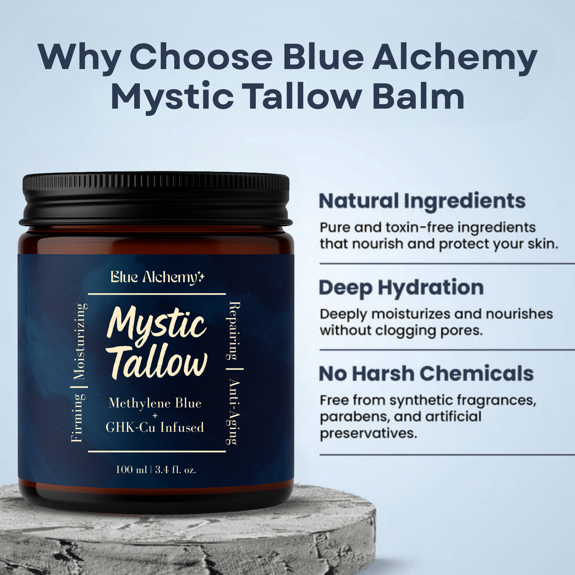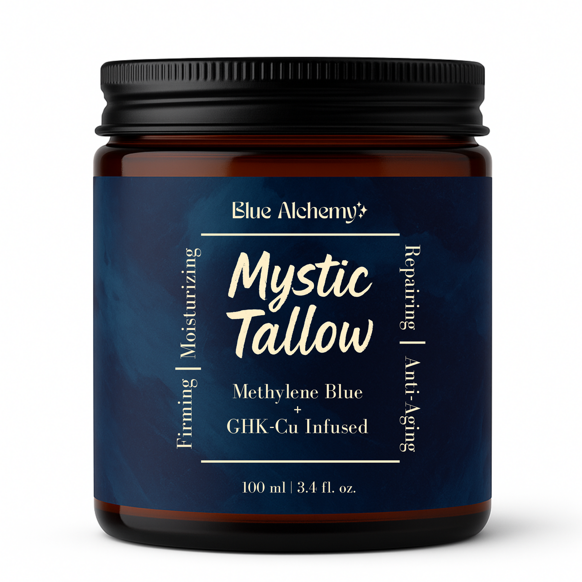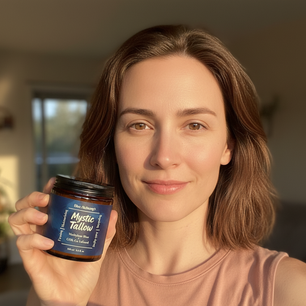 Mystic Tallow is enhanced with methylene blue, copper peptides, and honey—bringing advanced antioxidant and anti-aging benefits beyond basic moisture.