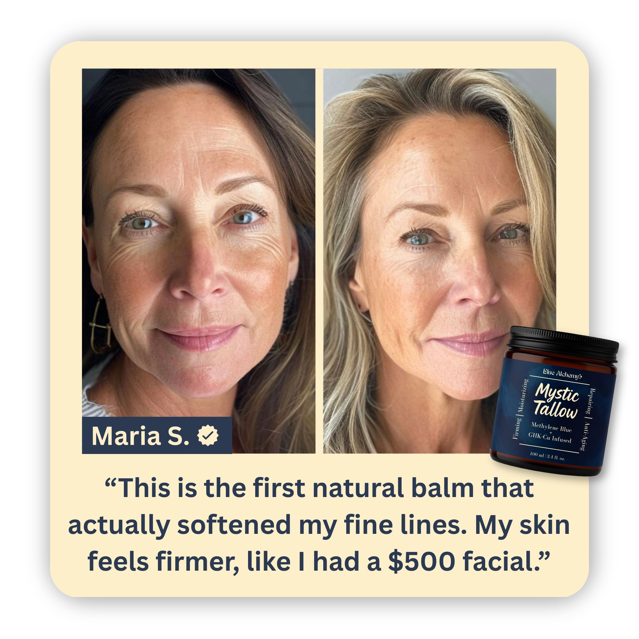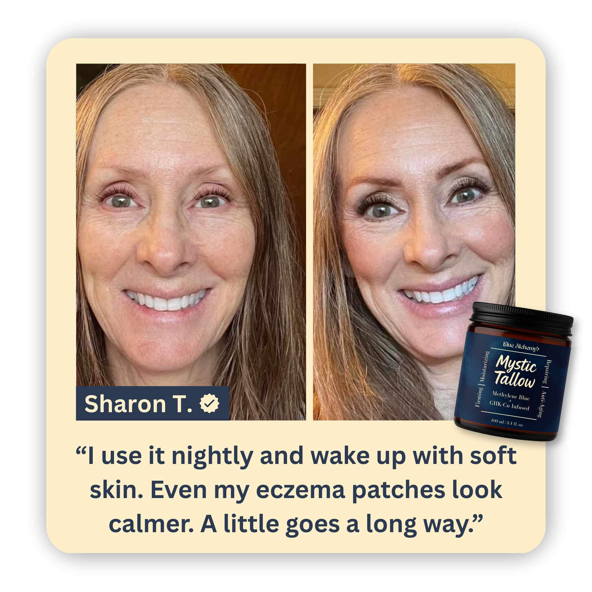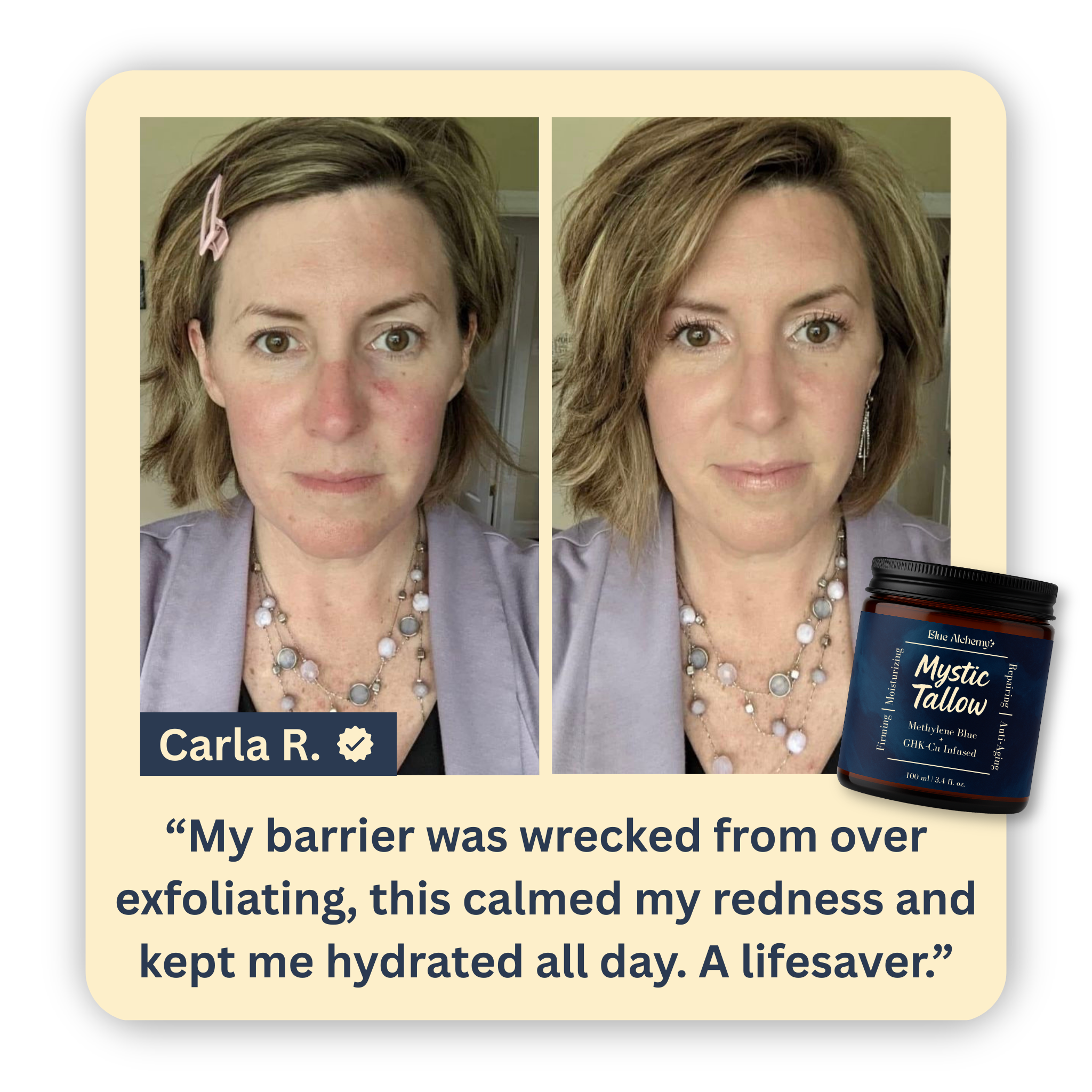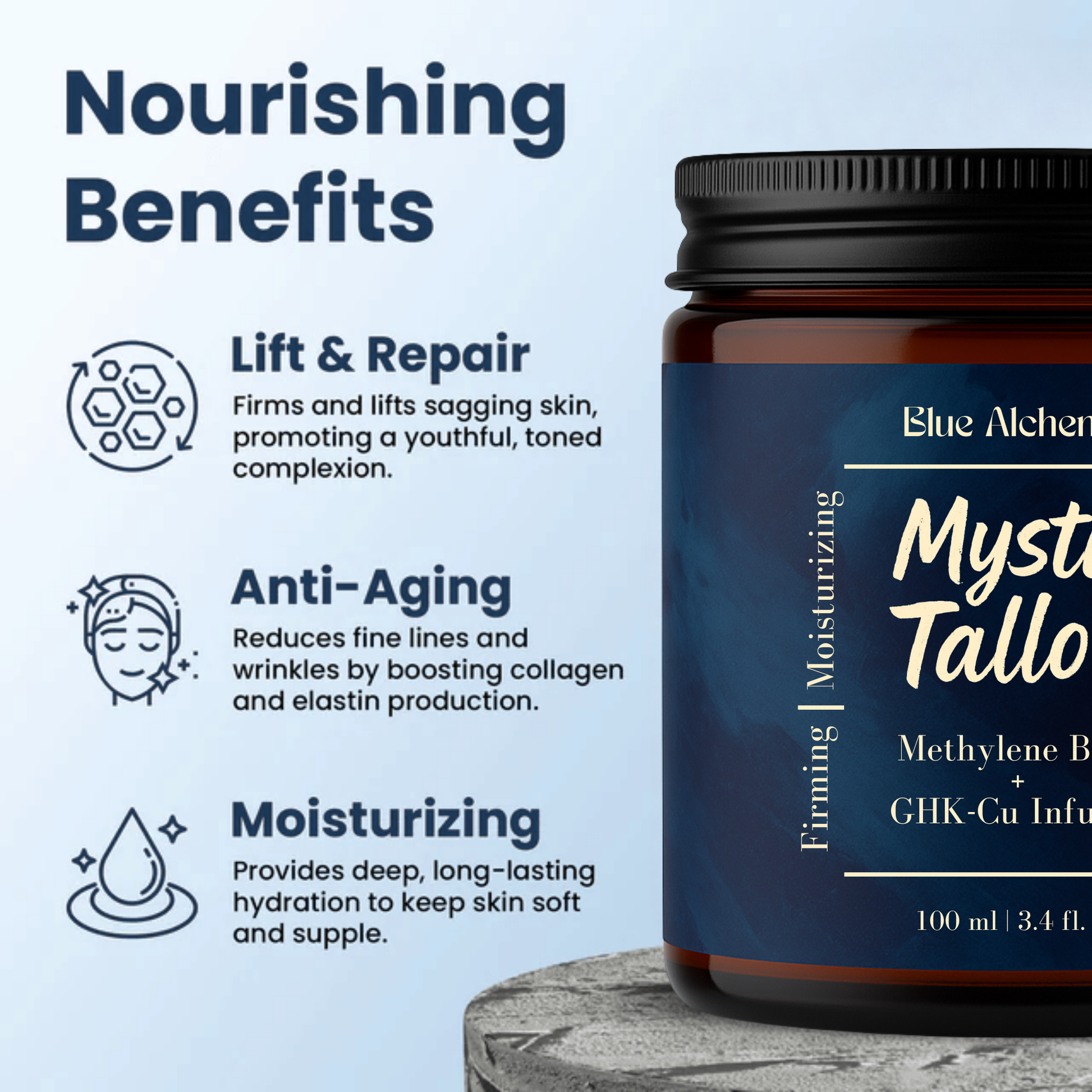 Mystic Tallow is enhanced with methylene blue, copper peptides, and honey—bringing advanced antioxidant and anti-aging benefits beyond basic moisture.