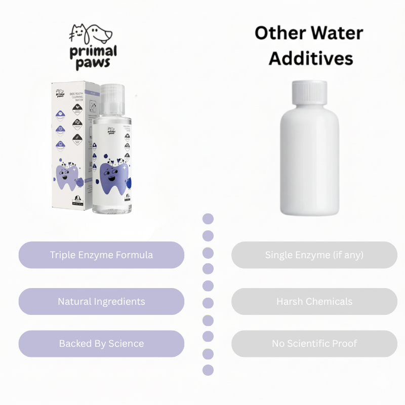 Chews only last minutes, and brushing only works for a short time after cleaning. Dental+ works continuously—every drink of water helps fight bacteria and protect your dog’s mouth all day long.