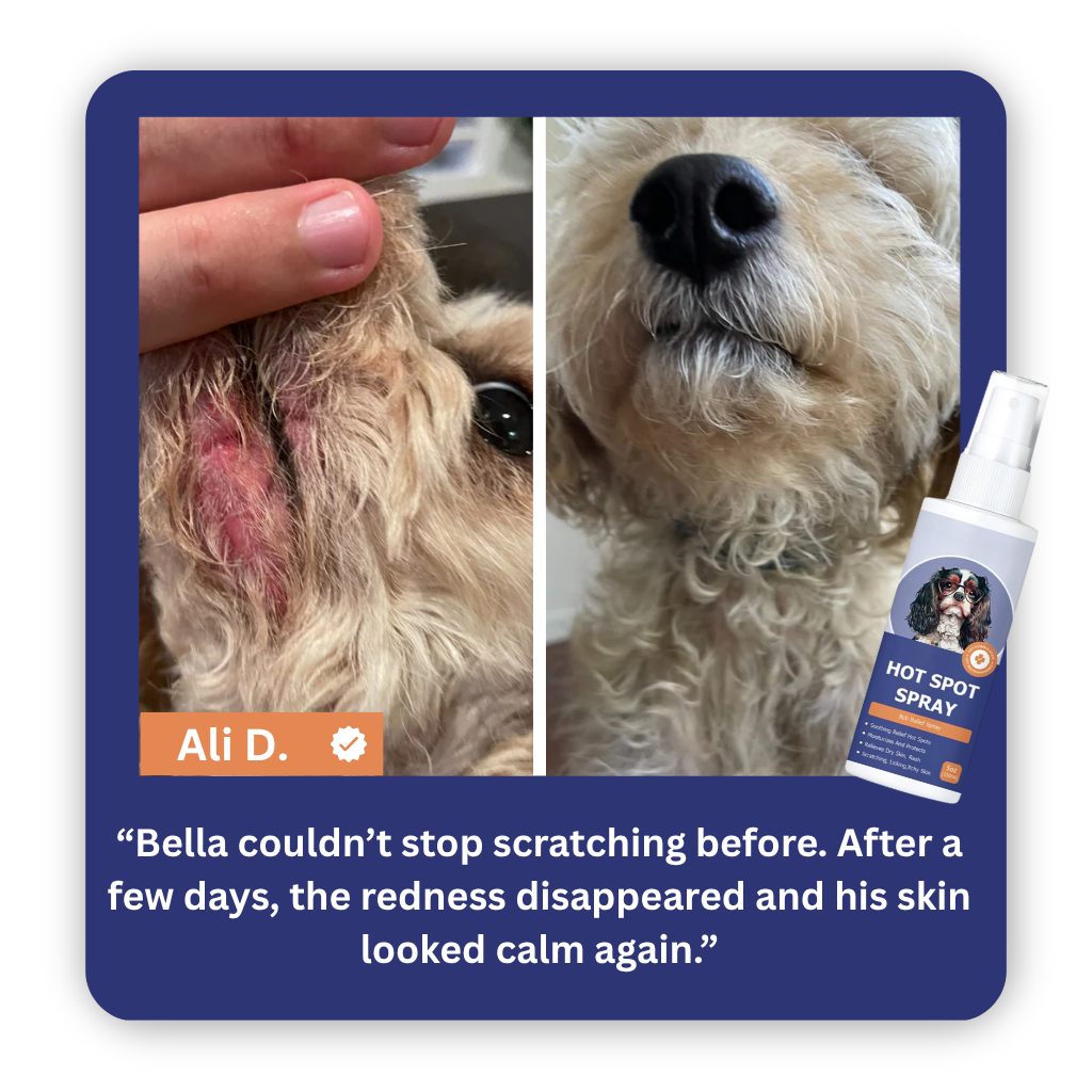 Most supplements can’t fix surface-level skin irritation. Our botanical-based spray targets the source directly—calming hot spots, redness, and itching fast so your dog finally finds real relief.